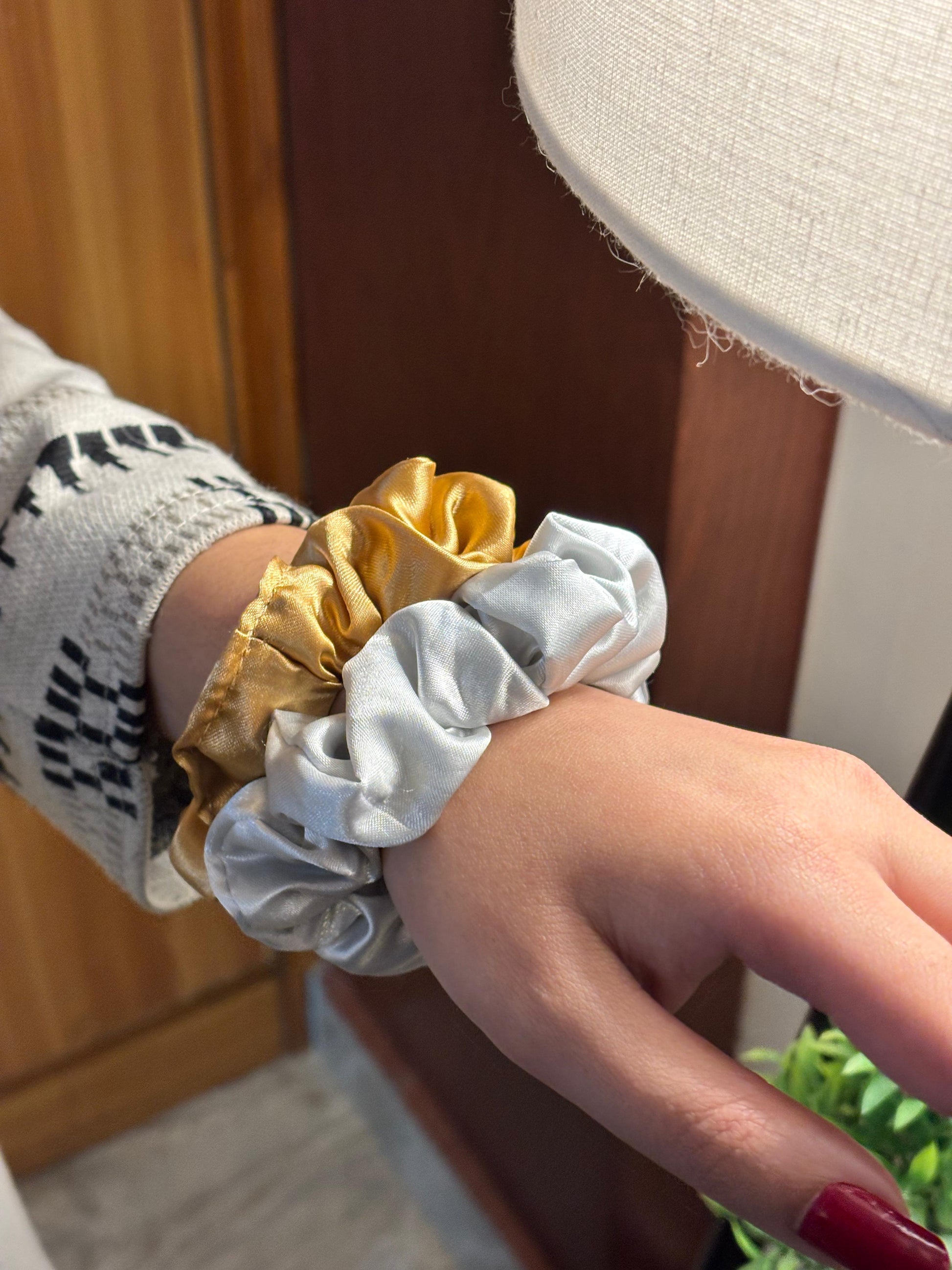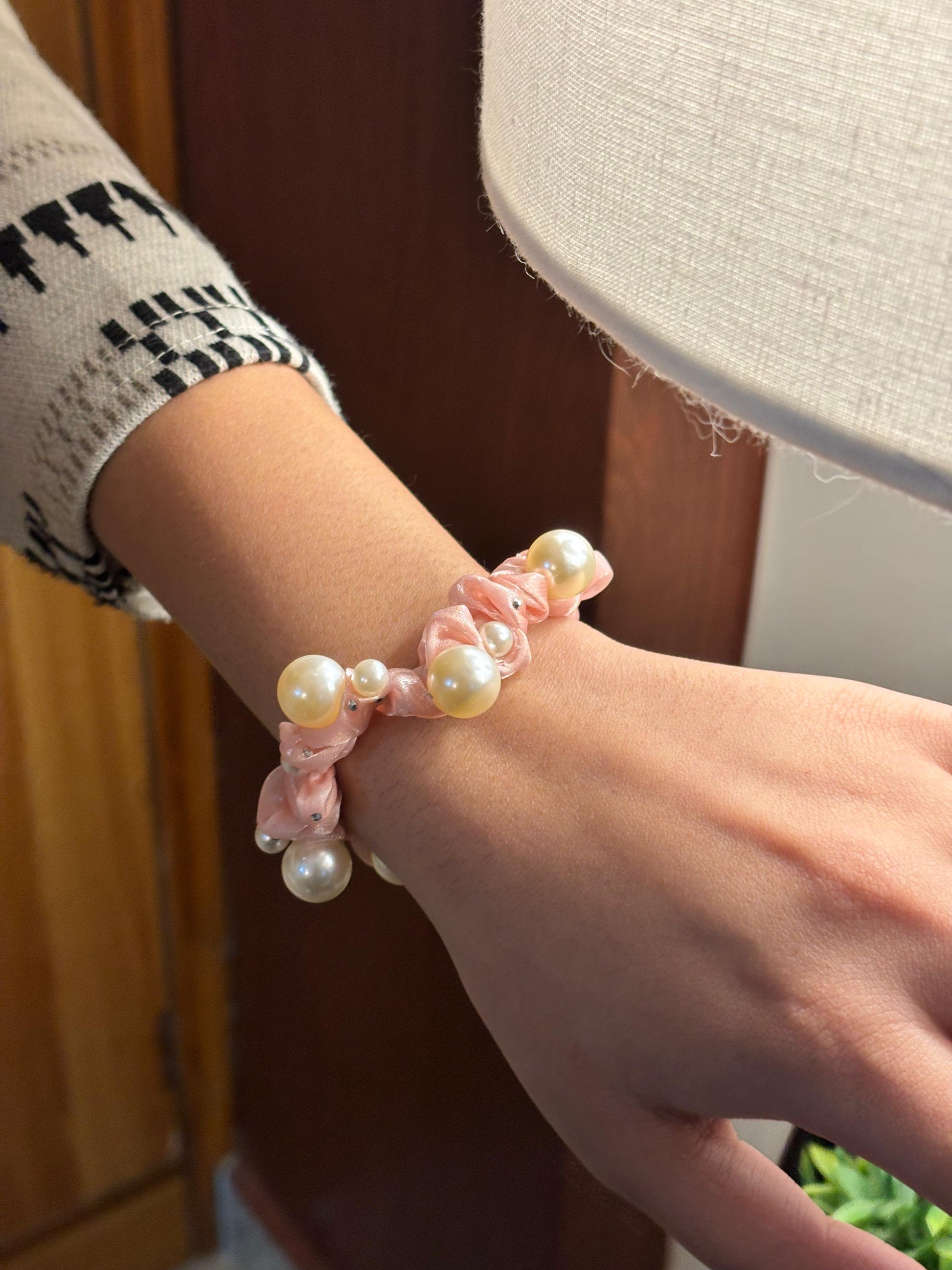 - Pink pearl scrunchie β Satin scrunchie with pearl embellishments.