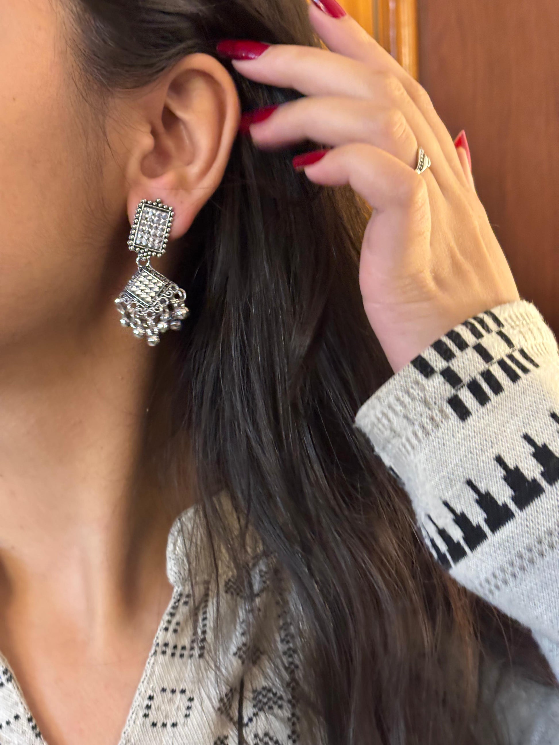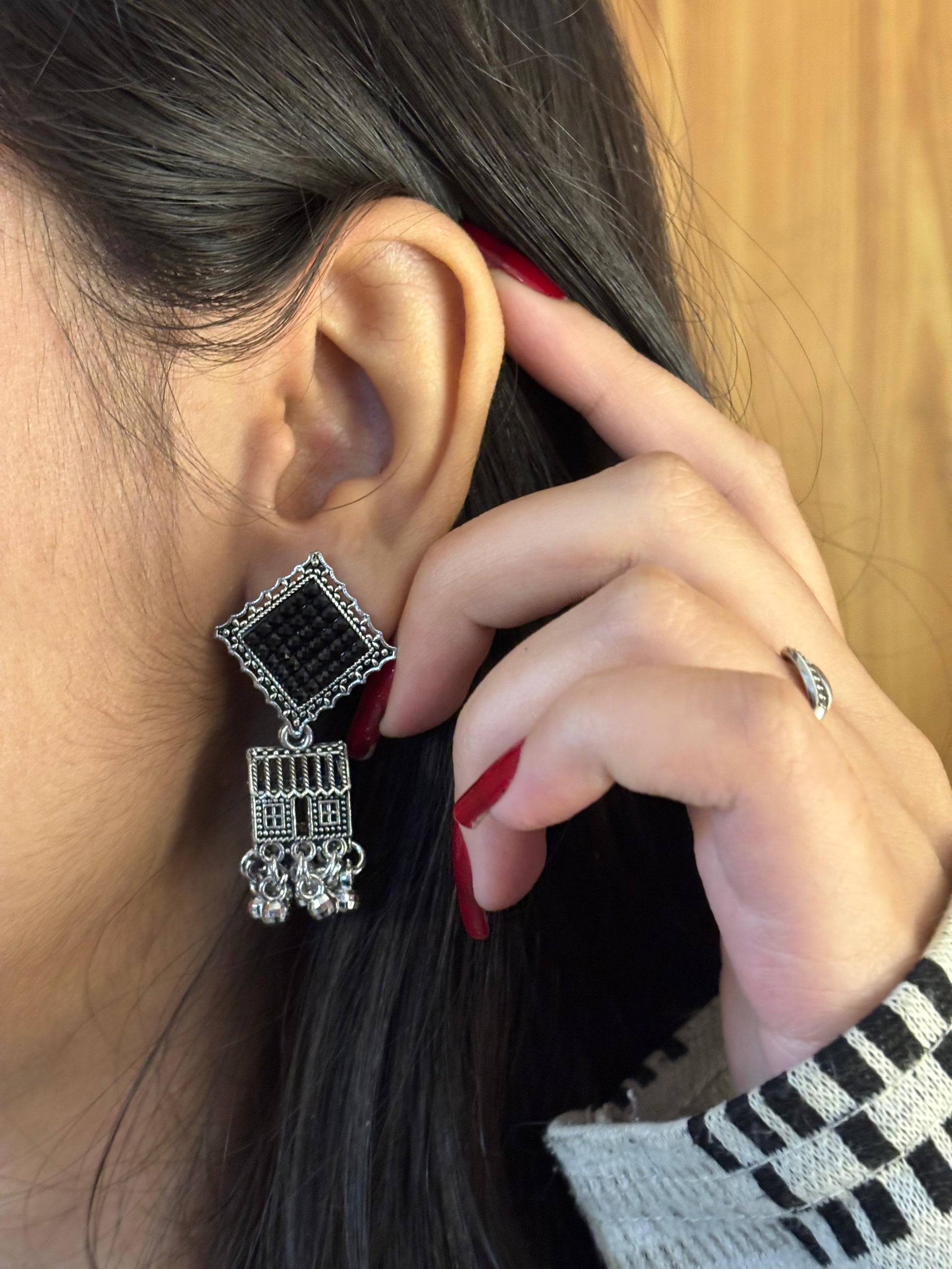 - Oxidised square jhumka earrings β Square engraved stud with layered dangling beads.