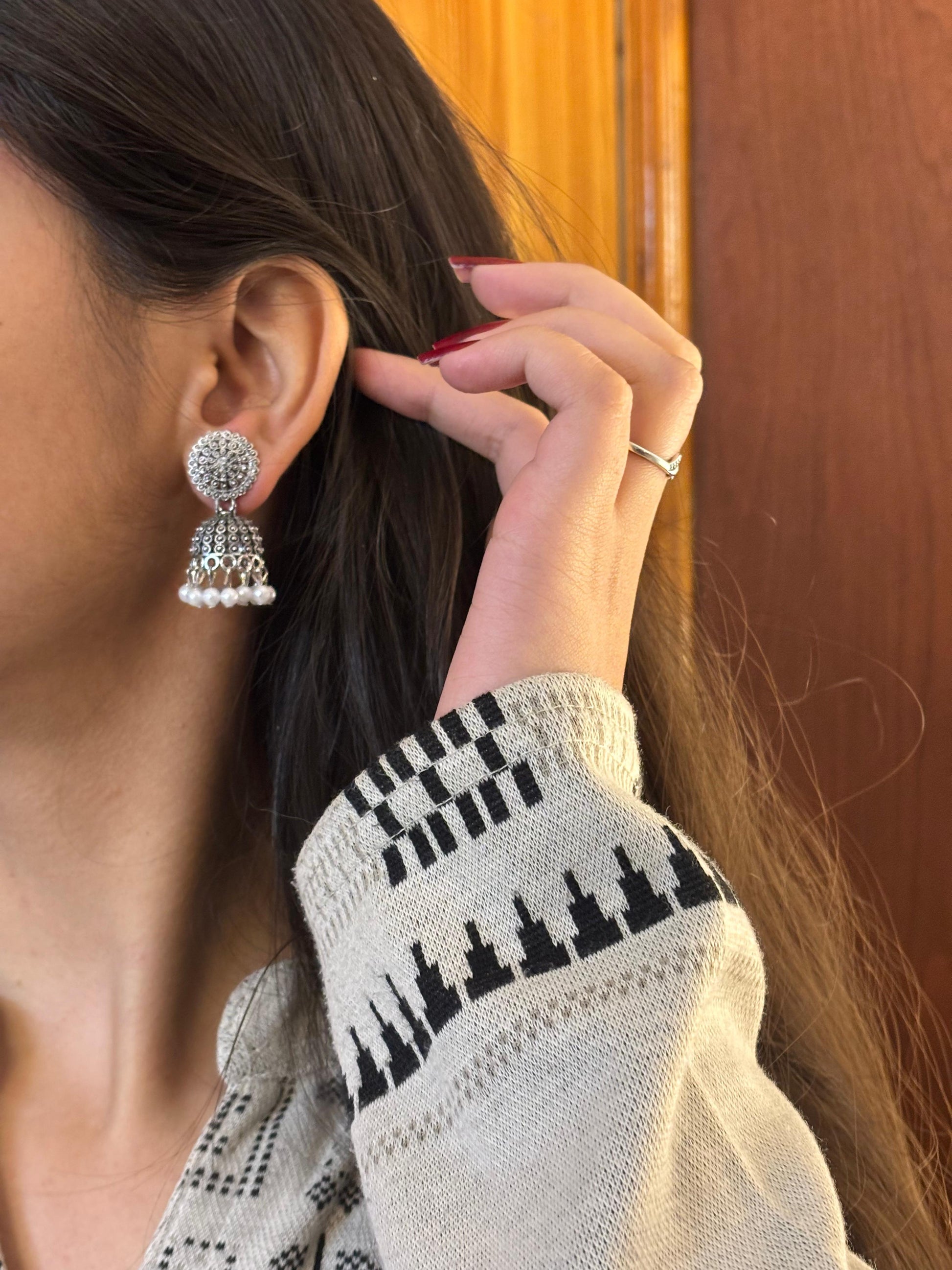 - Oxidised crescent jhumka earrings β Semi-circular design with hanging bead accents.